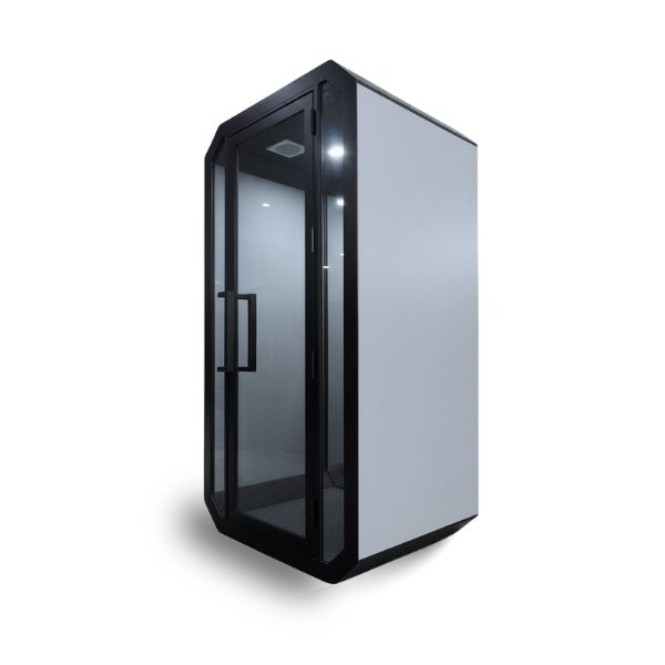 Ela funciona como uma espécie de “phone booth corporativa” premium, focada em concentração, chamadas e privacidade. O índice de isolamento reduz bastante conversa externa. Aos que estranham o silêncio absoluto, não se preocupem: o espaço garante conforto ideal para foco sem isolamento total. Estrutura composta em alumínio pistado, caixaria em MDF e lã de PET, vidro temperado 10mm, piso em carpet e sapatas niveladoras.