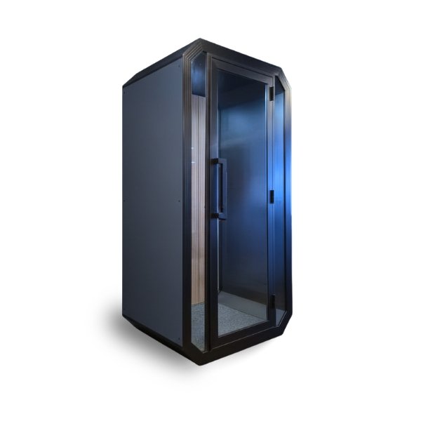 Ela funciona como uma espécie de “phone booth corporativa” premium, focada em concentração, chamadas e privacidade. O índice de isolamento reduz bastante conversa externa. Aos que estranham o silêncio absoluto, não se preocupem: o espaço garante conforto ideal para foco sem isolamento total. Estrutura composta em alumínio pistado, caixaria em MDF e lã de PET, vidro temperado 10mm, piso em carpet e sapatas niveladoras.