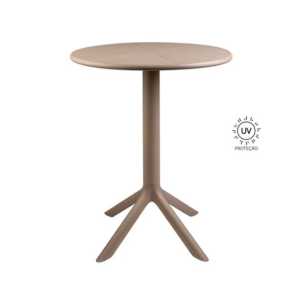 Mesa Drops em polipropileno para uso externo, com tampo redondo perfurado de 60 cm de diâmetro que proporciona leveza visual e ventilação. Base com haste central e pés estruturais em formato piramidal, garantindo estabilidade e resistência. Ideal para jardins, varandas e áreas de lazer.